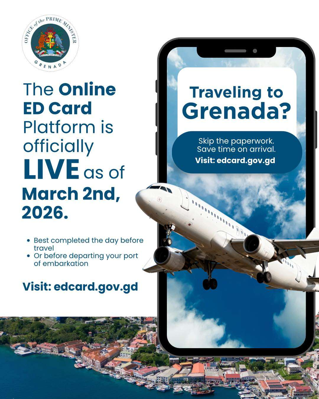 PR – The Government of Grenada announces the launch of its new online Embarkation/Disembarkation (E/D) card, replacing the traditional paper form and modernizing the way travelers enter and exit the country. This digital transition marks a first for Grenada and represents a significant step in the Government’s broader digital transformation agenda to enhance the delivery of public services.